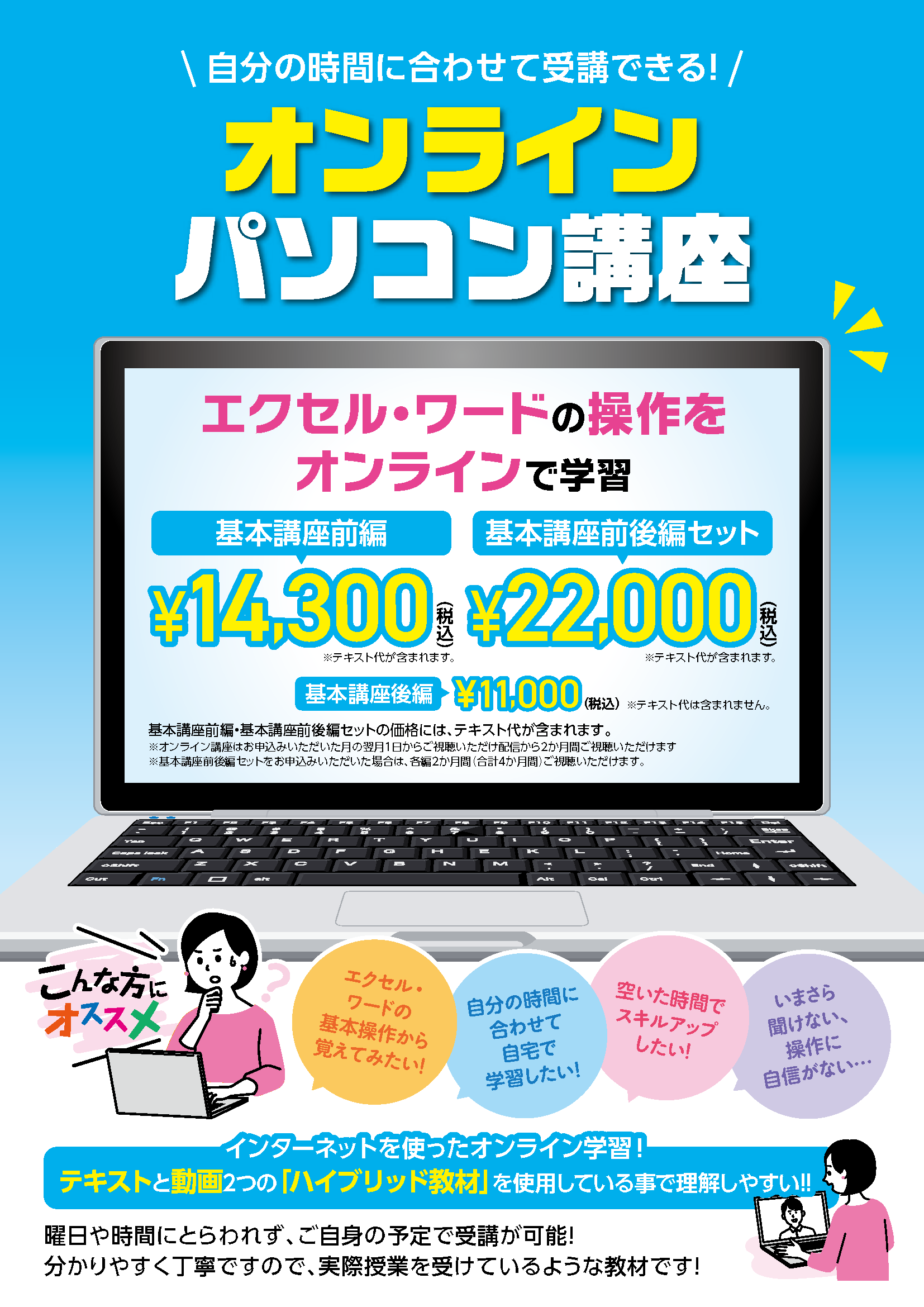 ※店頭パソコン教室をご利用いただく際は、別途入会金および授業料が発生いたします。