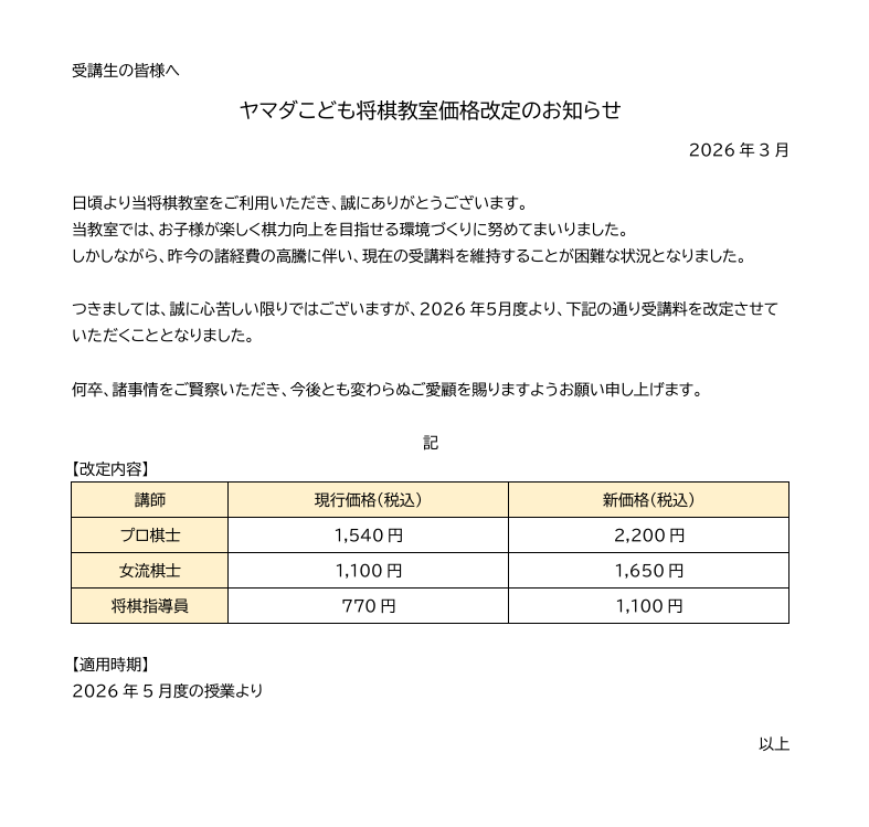 当店では、中学生以下のお子さまを対象とした「日本将棋連盟公認・ヤマダこども将棋教室」を開催しております。講師は、日本将棋連盟所属の指導員の先生をお迎えしております。